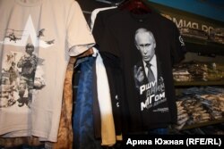 В военторге агитпоезда один из безусловных хитов – футболки с портретом Путина, со слоганом «Решу одним МИГом. Или двумя» и с цитатой президента: «Граница России нигде не заканчивается».
