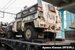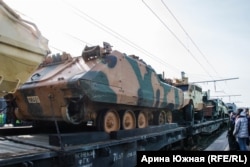 – На платформе вы видите турецкий автомобиль, предназначенный для транспортировки людей. Экипаж у него из 10 десантников и двух человек, которые управляют машиной. Броня у автомобиля – шесть миллиметров. На автомобиль можно установить пулемет 12-го калибра. Этот конкретный экземпляр был пробит сбоку танковым кумулятивным снарядом. Все, кто был внутри, сгорели заживо.