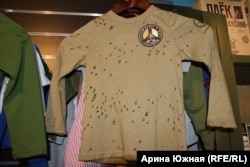 – Он самым большим спросом пользуется, – довольно сообщает продавец Антон. – У вас в Омске купили восемь футболок. Есть также в продаже и Шойгу. У него слоган другой: «Санкции МИГом исправим». Каждая такая футболка обойдется в 1200 рублей. А из детского очень стильно смотрится вот этот джемперок цвета хаки со значком «Принуждение к миру. Хмеймим».