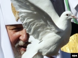 Патриарх Кирилл выпускает голубя во время богослужения в церкви в Киеве. 27 июля 2010 года.