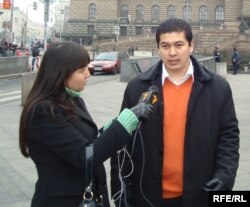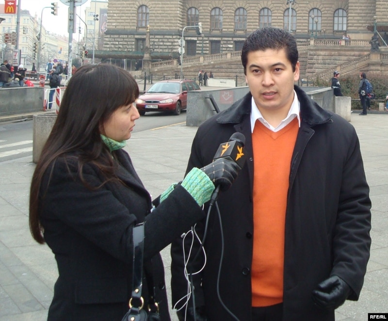 Казахский беженец из города Атырау Ануар Муратов дает интервью репортеру радио Азаттык после демонстрации протеста. Прага, 7 февраля 2009 года.