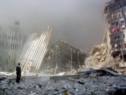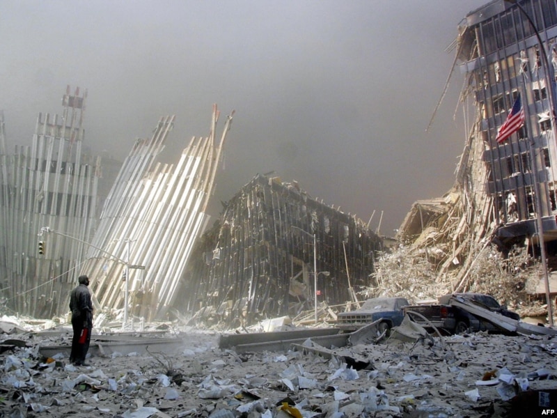 Мужчина стоит у руин Всемирного торгового центра, разрушенного вследствие теракта. Нью-Йорк, 11 сентября 2001 года.