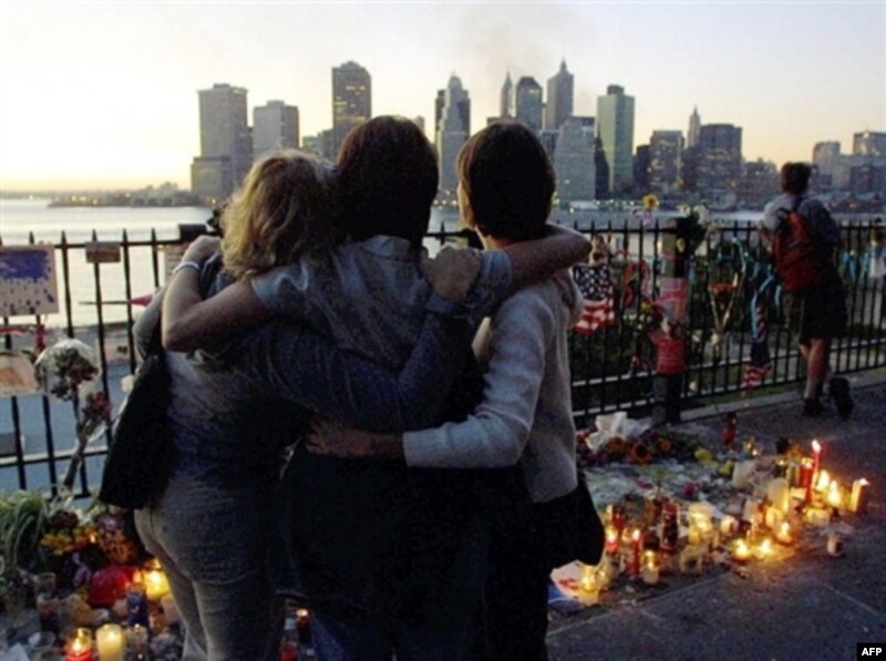 Три женщины стоят на набережной и обнимаются, глядя на все еще тлеющие остатки Всемирного торгового центра после теракта. Нью-Йорк, 16 сентября 2001 года.