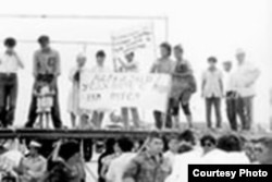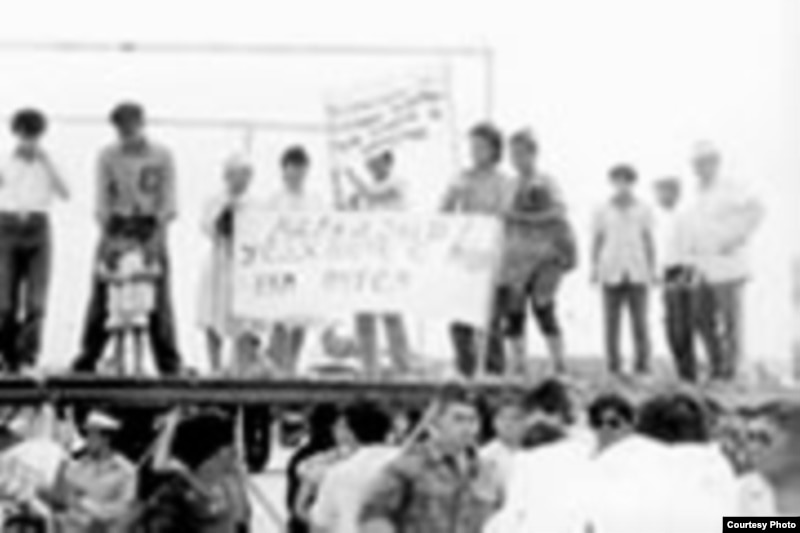 Волнения в Новом Узене в июне 1989 года. Фото с сайта Совета ветеранов спецотряда «Витязь» http://osn.bkb-vityaz.ru. Надпись на сайте гласит: «В городе Новый Узень вспыхнули массовые беспорядки».