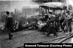 Досталось и пражскому городскому транспорту. На этом фото – еще одна баррикада на пути к зданию Чехословацкого радио. Для ее постройки пришлось использовать сразу три автобуса, но остановить танки они не смогли.