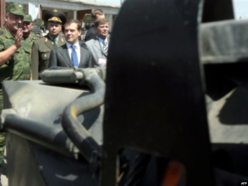 Президент России Дмитрий Медведев посещает 201-ю русскую военную базу в Душанбе. 29 августа 2008 года.