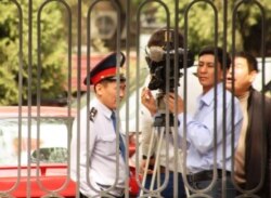 Люди в штатском снимают происходящее в связи со срывом спектакля "Идиоты". Алматы, 23 сентября 2011 года.