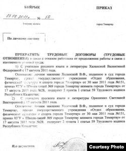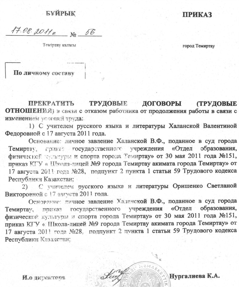 Копия приказа об увольнении учителей школы-лицея № 9 города Темиртау Светланы Орищенко и Валентины Халанской от 17 августа 20011 года.