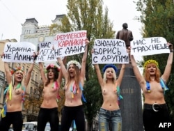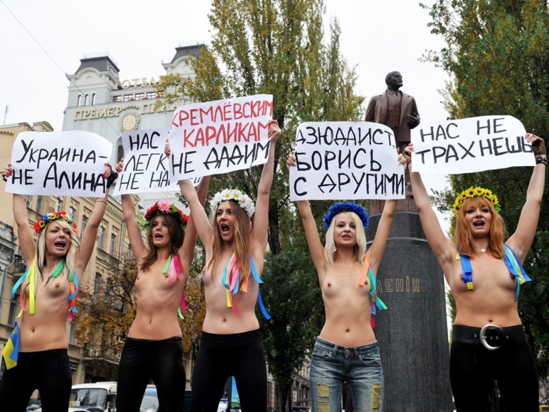Активисты группы «Фемен» протестуют против визита в Украину премьер-министра России Владимира Путина. Киев, 27 октября 2010 года.