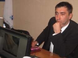 Гражданский активист Вадим Курамшин показывает видео, на котором видны синяки на теле погибшего заключенного Армана Капарова. Астана, 3 октября 2011 года.