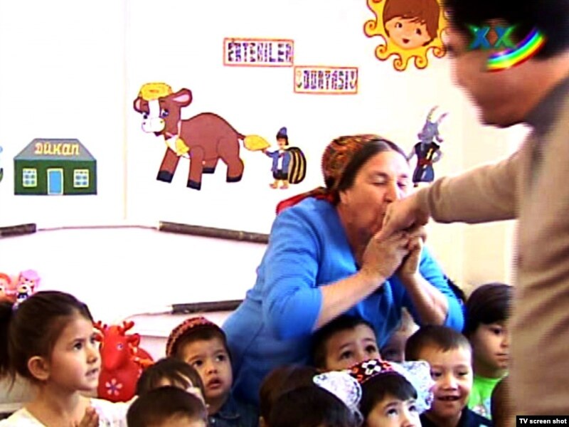 Президенту Туркменистана Гурбангулы Бердымухамедову целуют руку во время его посещения детского сада в Марыйском велаяте. 26 января 2011 года.