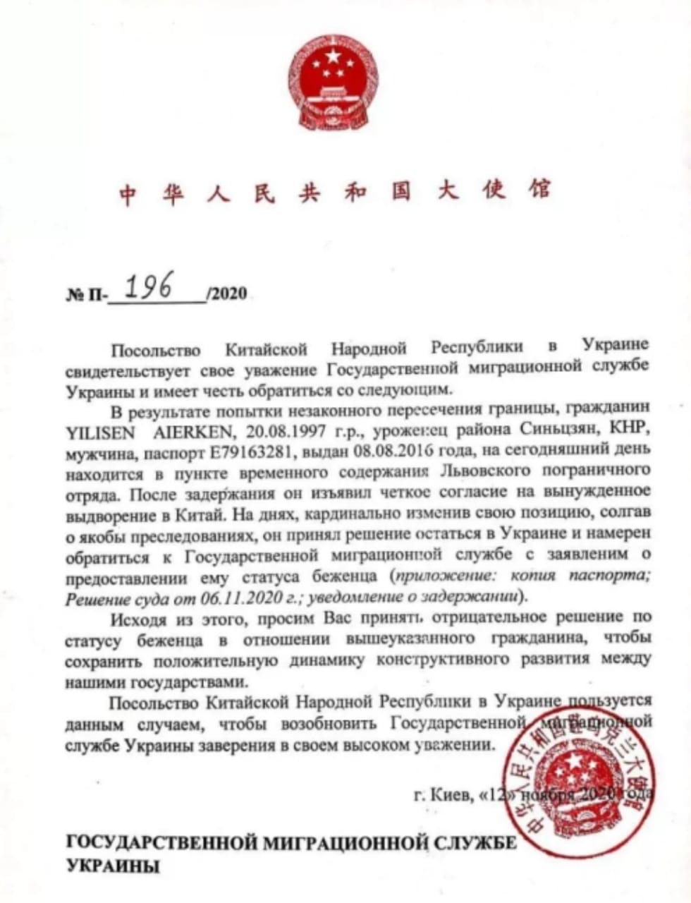 Посольство Китая в Киеве ходатайствовало о его возвращении в страну, написав в письме в Государственную миграционную службу Украины, копию которого удалось получить Азаттыку, что Еркинулы желает вернуться в Китай и лжет о преследованиях в Синьцзяне.