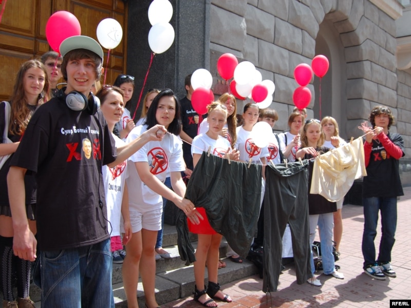 Активисты молодежной инициативы "За свободу слова" протестуют перед входом в штаб-квартиру Службы безопасности. Киев, 25 июня 2010 года.