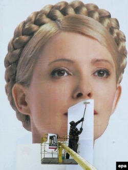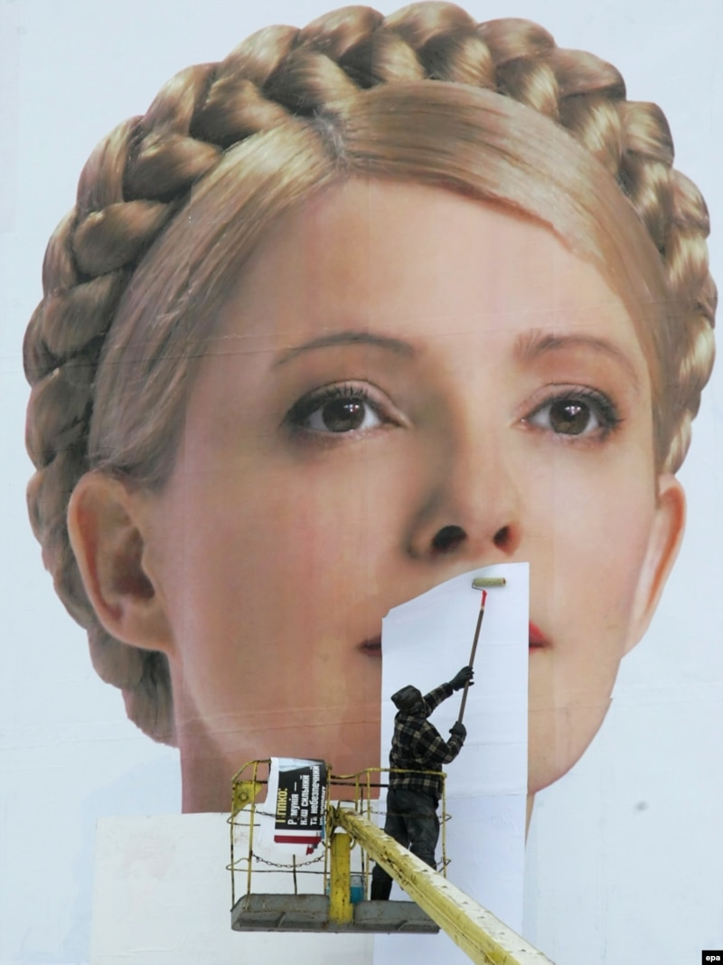 Муниципальный работник закрашивает предвыборный плакат кандидата в президенты Украины Юлии Тимошенко. Киев, 14 января 2010 года.