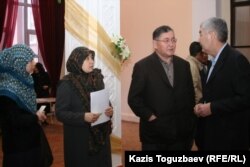 Слева направо: жены узбекских беженцев-мусульман, находящихся в тюрьме КНБ, главный редактор газеты "Жас Алаш" Рысбек Сарсенбай; генеральный секретарь ОСДП "Азат" Амиржан Косанов. Алматы, 29 января 2011 года.