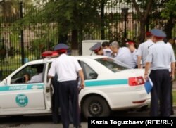 Полицейские не допускают к зданию прокуратуры жен узбекских беженцев-мусульман. Алматы, 9 июня 2011 года.