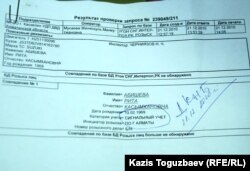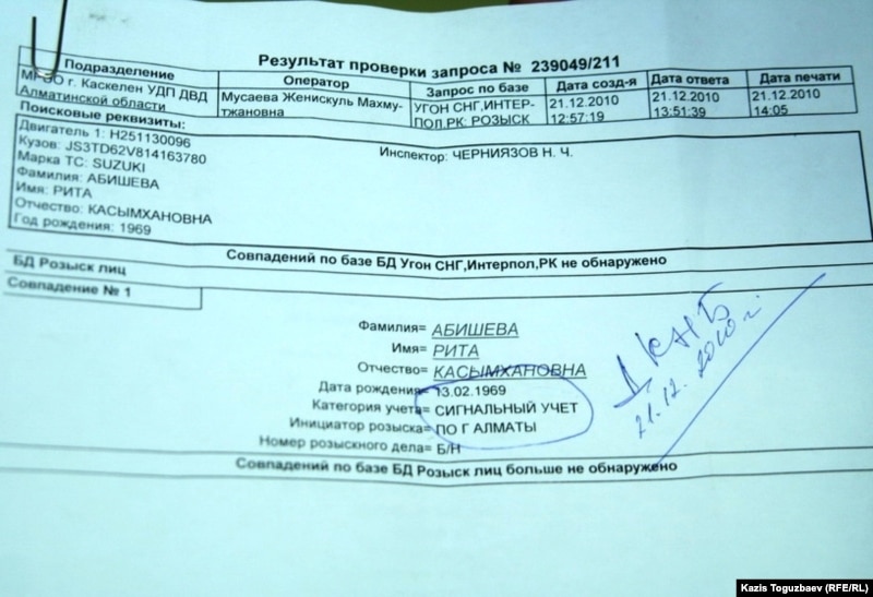 недоумевает Рита Абишева.Рита Абишева в подтверждение своих слов показала распечатку, сделанную в ГАИ Каскелена, где указано, что она числится в розыске и один из сотрудников полиции при этом рукой дописал, какой государственный орган подал на нее в розыск, а именно – ДКНБ. Она позволила сделать фотоснимок с этой распечатки, но отказалась сама фотографироваться.