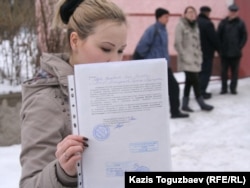 Алия Турисбекова, жена Владимира Козлова, демонстрирует журналистам правоустанавливающие документы на собственность дома. Алматинская область, Карасайский район, 22 февраля 2011 года.