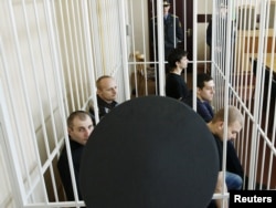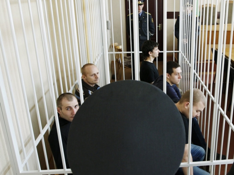 Павел Виноградов (крайний со стороны полицейского в правом ряду) на суде. Минск, 28 апреля 2011 года.