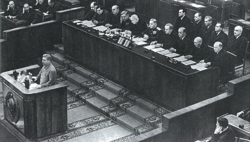 19-й съезд Коммунистической партии Советского Союза. На трибуне – Иосиф Сталин. Лидер Советского Казахстана Жумабай Шаяхметов сидит в первом ряду президиума (второй справа). Москва, 1952 год. Фото из книги Мадата Аккозина «Вернуть из забвения».
